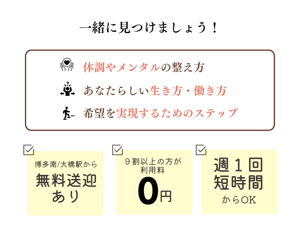 短い利用時間でも送迎をして頂いて本当に助かりました。通いはじめた頃は外にでることがつらく、通院以外ひきこもった状態が続いていました。週に1回の午前中と少ない利用でしたが快く受け入れてもらえました。